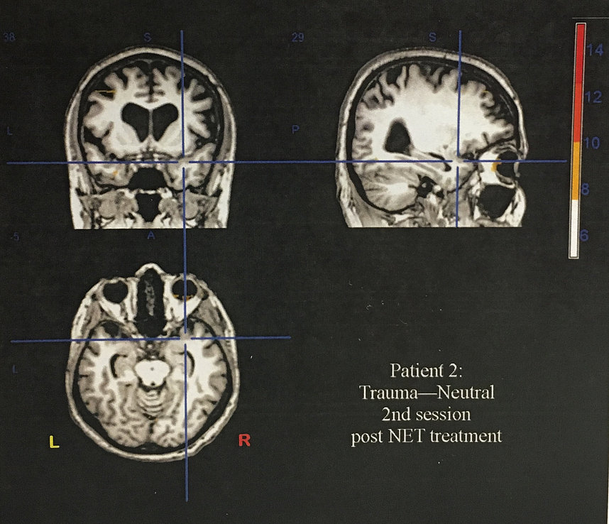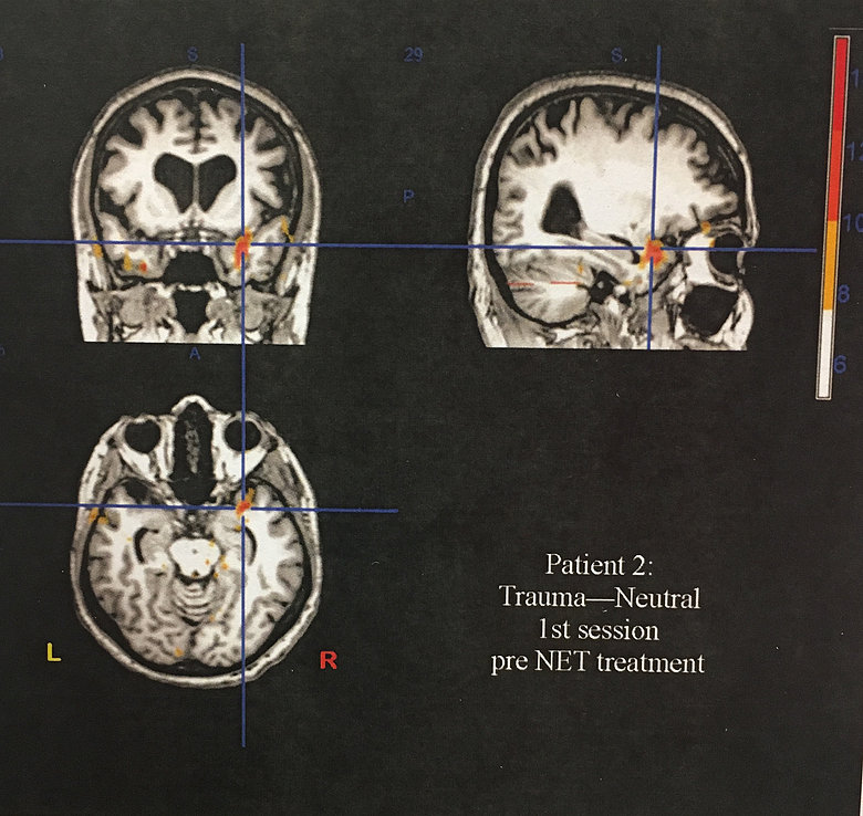 emotional traumas. It is interesting to note that a scar will always have a mental or emotional trauma existing with it whether it be from injury or surgery. The images below are functional MRIs of an individual with PTSD, post-traumatic stress disorder. these images were taken at a research study at Thomas Jefferson University in Philadelphia. The simple and elegant technique known as NET was able to eliminate the symptoms of PTSD quickly and without drugs.