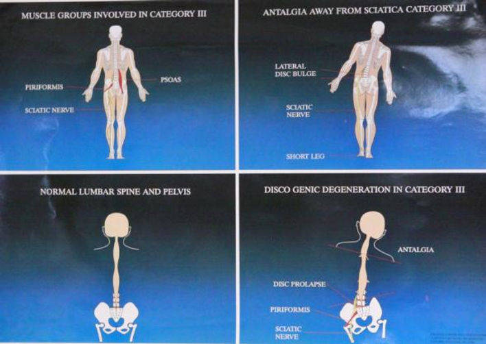 Category three is a misalignment of the spinal column on the pelvis. With a category three the lumbar discs have become compromised by a narrowing of the inter-vertebral foramen, the opening between the vertebra where the the nerve root exits. People often refer to this as a pinched nerve. Category three produces pain in the low back and sometimes pain can radiate down the leg along the sciatica nerve. Correction is done in the face down or prone position placing the SOT wedges under the hip on one side and the head of the femur on the other.